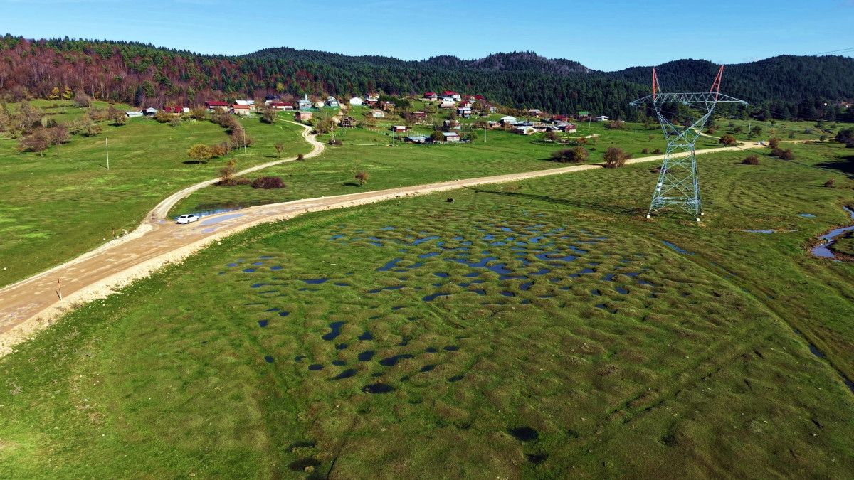 Havadan kaydedilen görüntülerde, yaylanın karstik yapısı nedeniyle oluşan doğal çöküntüler ve yıl boyunca su akışıyla şekillenen menderesler net bir şekilde görüldü.